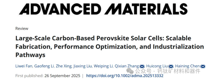 近日,宁夏大学张啟先副教授与北京航空航天大学陈海宁教授、刘慧丛副教授合作,在国际著名期刊Advanced Materials上发表了题为“Large-Scale Carbon-Based Perovskite Solar Cells: Scalable Fabrication, Performance Optimization, and Industrialization Pathways”的高水平综述文章。北京航空航天大学、宁夏大学为共同通讯单位,张啟先、陈海宁和刘慧丛为共同通讯作者。