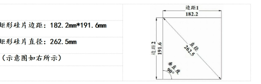 矩形硅片边距:182.2mm*191.6mm 矩形硅片直径:262.5mm。 6 家光伏企业共同倡导和推动上述标准化矩形硅片尺寸方案为行业内更多的企业所接受,并称是“为了进一步解决因矩形硅片尺寸差异导致的产业链硅片供应困难,材料成本增加等困扰”。