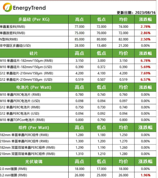 本周硅片价格小幅反弹,M10硅片主流成交价格为3.15元/片,涨幅达到6.78%;G12主流成交价格为4.2元/片,上浮了7.69%。从供给端来看,8月硅片排产与电池片基本处于平衡状态,硅片企业库存压力较小;从需求端来看,目前电池片利润相对可观,对硅片的采购积极性较高;硅料价格上涨对硅片价格形成有力支撑,近期硅片龙头企业上调硅片价格,其他企业陆续跟涨,硅片价格小幅上涨。在需求持续下,硅片供应略显紧张,预计短期内价格仍有一定上行空间。