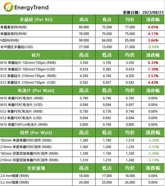 M10电池片主流成交价为0.76元/W;G12电池片主流成交价为0.74元/W;M10 单晶TOPCon电池人民价格为 0.8元/W。