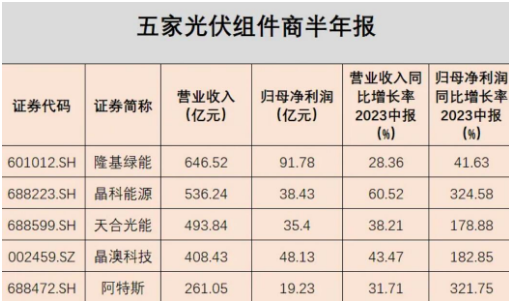 规模最大的五家公司,净利润同比增速全部超过100%,增幅最大的甚至超过320%。今年上半年,硅料价格急跌,让光伏组件厂商的盈利大幅提升。 A股半年报收官,隆基绿能 与晶澳科技 相继于8月30日晚间发布半年报,至此光伏“组件五虎”的中报全部出炉。隆基绿能的业绩规模依然稳坐第一,净利润规模高出第二名晶澳科技近一倍,但营收与净利增速放缓明显,且在A股5家最大的组件公司中最低。晶科能源(688223.SH)的净利润增速高达324%,上半年出货量中N型组件占比一半以上。 在光伏电池技术进入巨大技术变革的当下,N型产品的投产量、出货量是各家组件商业绩增速分化的重要因素之一。 而从中报也可以看出,今年二季度,硅料价格下跌,带动了下游装机需求,也让组件环节的盈利大幅提升,多数组件厂商的净利润增速远超营收增速。 上半年组件商盈利能力修复明显 今年上半年,硅料价格急速下跌,单吨最低价格一度跌穿7万元/吨,较去年最高点下跌了约70%。产业链价格下跌,带动了下游装机需求持续增长,利好直面客户的组件环节。根据国家能源局数据,1-6月,我国太阳能新增装机78.42GW,较去年同期相比增长47.54GW,涨幅达到154%。截至6月底累计装机4.7亿千瓦。 受硅料下跌影响,前述五家组件商中,除了隆基绿能,其他四家净利润增速均超过100%。其中,晶科能源、阿特斯净利润增速达到3倍以上,分别为324.58%、321.75%。晶澳科技和天合光能的净利润也翻倍增长,分别为182.85、178.88%。值得一提的是,上半年,这四家组件商的净利润增速大幅超过营收增速,体现出产业链降价后,组件环节盈利能力转暖的情形。 ![]() 对于业绩大涨,多家组件企业均称,受益于上游硅料供给扩张带动的主产业链价格下行,组件产品毛利率同比修复。同时,全球光伏市场需求保持快速增长,电池组件出货量大幅增长。 今年上半年,隆基绿能实现营业收入646.52亿元,同比增长28.36%;净利润91.78亿元,同比增长41.63%,扣非净利润90.6亿元,同比增长41.46%,是上述五家组件商中唯一一家净利润增幅远超营收增幅的公司,而且净利润超过第二名、第三名晶澳科技和晶科能源的总和。其中,第二季度隆基绿能实现净利润约55亿元,为单季历史最高。 上半年,隆基绿能的单晶硅片出货量为52.05GW,其中对外销售22.98GW,自用29.07GW;单晶电池出货量31.50GW,自用28.22GW,对外销售3.28GW;实现单晶组件出货量26.64GW,对外销售26.49GW,自用0.15GW。但北向资金却在二季度大幅卖出隆基绿能2.43亿元,为单季对隆基绿能的最大幅度减持。 晶科能源正在N型产品道路上开足马力,上半年实现净利润同比增速最高,也是主要受益于N型产品出货量持续增长,该类产品已经占报告期内出货量的50%。截至二季度末,晶科能源的已投产N型TOPCon电池产能约55GW。 另外,晶科能源正在规划建设年产56GW垂直一体化大基地项目,将是全球首个包含硅片、电池、组件的“超级一体化”太阳能工厂,也是目前已规划行业最大的N型一体化生产基地。 在近期一次调研中,晶科能源透露,将进一步上调2023年底产能目标,预计到年底形成85GW硅片、90GW电池和110GW组件,其中N型产能预计占比75%,海外一体化产能12GW。同时,该公司还将全年出货预期上调到70-75GW,N型占比60%,其中三季度组件预期出货19-21GW。目前,该公司下半年在手订单覆盖度超80%。 今年6月,阿特斯 从美股回A上市科创板,近日披露的回A后首份半年报显示,相比其他四家同行,阿特斯的营收、净利规模还有不小差距。报告期内,公司实现营业收入261.05亿元,净利润19.23亿元,预计全年组件出货30-35GW。 硅料硅片价格小涨,组件或迎涨价 自通威股份 进军组件后,其出货量也受市场高度关注。上半年,通威股份实现营业收入740.68亿元,同比增长22.75%;净利润132.70亿元,同比8.56%;扣非净利润126.2亿元,同比增幅1.02%。 目前,通威股份主要提供TPC、TNC、THC、半片、多主栅等技术的组件产品,上半年累计实现组件销量8.96GW,并连续中标包括华润电力、三峡、中电建、国家能源集团等多个项目,累计中标容量超9GW,但较头部组件商的出货量仍有一定距离。 三季度以来,硅料价格经过前期急跌后走稳,但在近期,在下游需求推动下,N型与P型硅料价格呈现分化,均为小幅上涨,硅片价格同步上扬,组件端或面临利润承压的局面。 根据中国有色金属工业协会硅业分会数据,8月28日以来的一周,国内N型硅料价格在9万-9.5万元/吨之间,成交均价为9.13万元/吨,周环比涨幅为2.47%,单晶致密料区间在7.4万-8.4万元/吨,成交均价为7.92万元/吨,周环比涨幅为5.46%。 硅业分会预计,短期内,硅料市场供需仍将保持不平衡状态,硅料价格仍将持续微涨,预计10月份硅料供应会有所好转。 光伏各环节的供需局面与产品价格密切挂钩。近期,硅片企业去库明显,7月以来,硅片价格持续小幅上涨。需求端来看,下游需求向好带动电池排产提升,硅片采购积极性提高;另一方面,成本端多晶硅价格持续上涨支撑硅片价格上行。 8月21日和8月25日,TCL中环 与隆基绿能两大硅片龙头相继宣布上调硅片价格。有机构分析认为,组件端前期积压的高价订单预计已基本消化,当前电池价格对部分专业化组件企业成本压力较大,短期不排除组件价格小幅上涨的可能。 “N型产品的组件、硅料、电池盈利性都会相对P型更好,我们预计近期P型和N型硅料的价格差将进一步拉大,主要系N型需求较旺盛所致。N型产品产能和出货量较