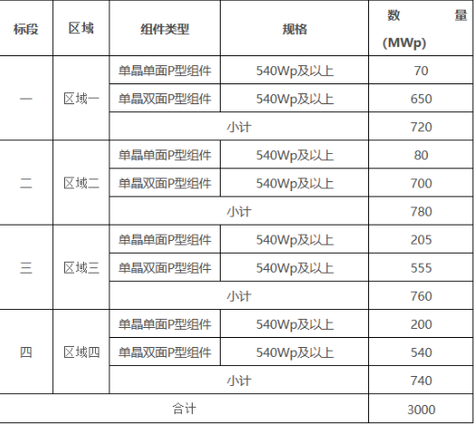 本项目标段一至四招标规模的太阳能电池组件。采用单晶单/双面P型组件540Wp及以上太阳能电池高效组件、带边框、配套组件串接插头、配套备品备件及专用工器具的供应、工厂试验、包装、保险、运输到目。