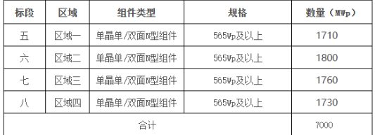 本项目标段五至八招标规模的太阳能电池组件。采用单晶单/双面N型组件565Wp及以上太阳能电池高效组件、带边框、配套组件串接插头、配套备品备件及专用工器具的供应、工厂试验、包装、保险、运输到目的地、交货、培训、安装指导、功能实现,配合现场调试和试验、参加试运行、竣工验收,负责质量保修工作。