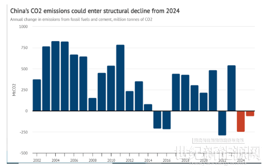 中国每年化石燃料和水泥二氧化碳排放量同比变化。单位:百万吨。