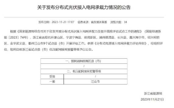 11月21日,浙江省发改委发布《关于发布分布式光伏接入电网承载力情况的公告》,公告显示,浙江省选取杭州萧山区,宁波宁海县、前湾新区,湖州德清县、长兴县,嘉兴海宁市,绍兴柯桥区,金华武义县,衢州江山市9个试点县(市)开展分布式光伏接入电网承载力及提升措施评估工作。参照《分布式电源接入电网承载力评估导则》,经组织评估,将江山市的低压配网接网预警等级评定为一般。
