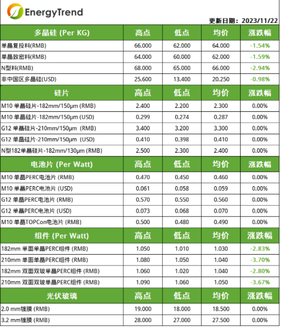 本周组件价格全线下探,182单面单晶PERC组件主流成交价为1.03元/W,210单面单晶PERC组件主流成交价为1.04元/W,182双面双玻单晶PERC组件成交价为1.04元/W,210双面双玻单晶PERC组件主流成交价为1.05元/W。从供给端看,目前部分龙头组件厂商P、N型组件的经销渠道价格均已跌破1元/W。近期项目开标价格价格陆续创下新低,当前组件厂商间竞争已高度内卷,场内价格水温低至冰点,在N-P型迭代关键期,P型在如此低价背景下,产能或将正式迈入出清阶段。从需求侧看,根据国家能源局发布数据显示,10月份新增光伏装机量环比再次下跌,需求转弱信号明显,分布式因容量告急而难以支撑大规模增量,地面集中式采购也进入淡季,海外需求暂无明显回暖迹象,因此终端对组件采购需求难言乐观。临近年末财报收官,各厂商面临出货量往全年指引目标冲刺压力,因此库存出清压力较大,在与终端博弈过程中,明显处于弱势,被迫采取以价换市策略。本周价格全线走低,预计仍将磨底下行。