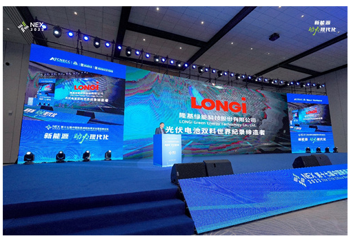 11月23日,在第十七届中国新能源国际博览会暨高峰论坛上,隆基绿能董事长钟宝申出席论坛并宣布,隆基绿能之前打破的晶硅单结电池(26.81%)和晶硅-钙钛矿叠层电池(33.9%)两项电池效率世界纪录最近被收录在美国国家可再生能源实验室(NREL)的《太阳电池最高研究效率图》中,隆基成为两大电池赛道效率世界纪录的“双料冠军”。