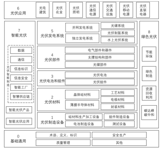 一、产业发展概述 太阳能光伏产业(以下简称光伏产业)是基于半导体技术和新能源需求而深入融合并快速兴起的朝阳产业,发展以光伏为代表的可再生能源对于应对全球气候变化、推动全球能源变革具有重要意义。我国光伏产业经过十余年快速发展,特别是党的十八大以来,在中央决策部署和业界共同努力下,已经成为获得全球通行名片、实现端到端安全可控、有望率先实现高质量发展的战略性新兴产业。2022年,我国光伏产业规模实现持续增长,技术创新水平加快提升,智能光伏示范引领初见成效,市场应用持续拓展扩大。展望未来,在国家“2030年碳达峰,2060年碳中和”以及“构建以新能源为主体的新型电力系统”战略目标下,光伏产业发展空间更为广阔。 光伏产业链包括光伏材料、光伏电池、光伏组件、光伏部件、光伏发电系统、光伏应用以及光伏制造设备等,如图1所示。 ![]() 图1 光伏产业链 二、总体要求 (一)总体思路 以习近平新时代中国特色社会主义思想为指导,全面贯彻落实党的二十大精神,立足新发展阶段、贯彻新发展理念、服务新发展格局,推动光伏产业高端化、智能化、绿色化、融合化发展,深入落实《国家标准化发展纲要》,认真落实《新产业标准化领航工程实施方案(2023—2035年)》,围绕光伏产业链的构建,结合智能化与绿色化发展进程,支持构建以新能源为主体的新型电力系统发展方向,以提升产品质量和技术水平、满足应用需求、拉长“长板”为出发点,进一步加强光伏标准化工作顶层设计,强化全产业链标准协同,有效增加标准供给、强化标准应用实施、统筹推进标准国际化,切实发挥好标准对光伏产业高质量发展的支撑和引领作用。 (二)工作目标 到2025年,按照统筹规划、分类施策,协同推进、急用先行,立足国情、开放合作的原则,不断完善和优化科学合理、技术先进、协调配套的光伏产业标准体系;新制定国家标准和行业标准40项以上,支持社会团体自主研制先进团体标准,实现光伏产业基础通用标准和重点标准的全覆盖;强化标准应用示范,发挥标准在推动光伏技术进步和产业发展中的支撑和引领作用,促进光伏产业的持续健康发展。 三、标准体系结构及内容 (一)体系结构 太阳能光伏产业综合标准化技术体系结构反映标准体系各部分的组成关系,如图2所示。