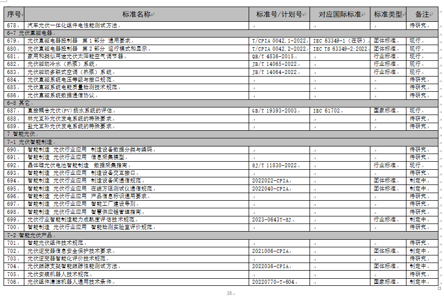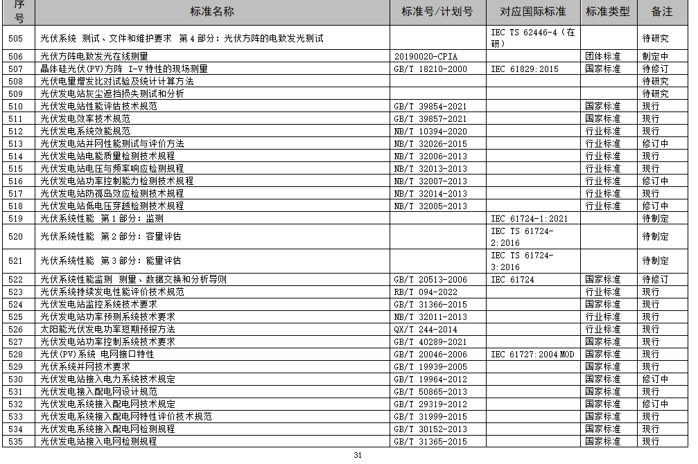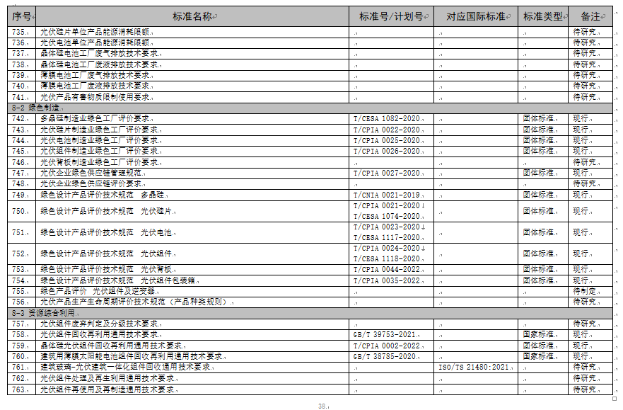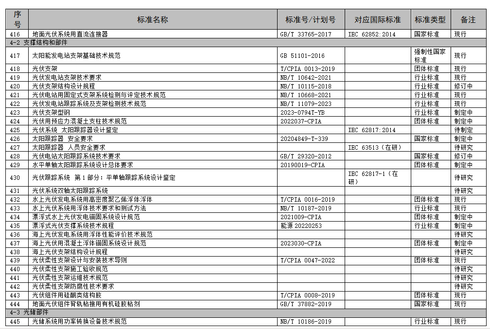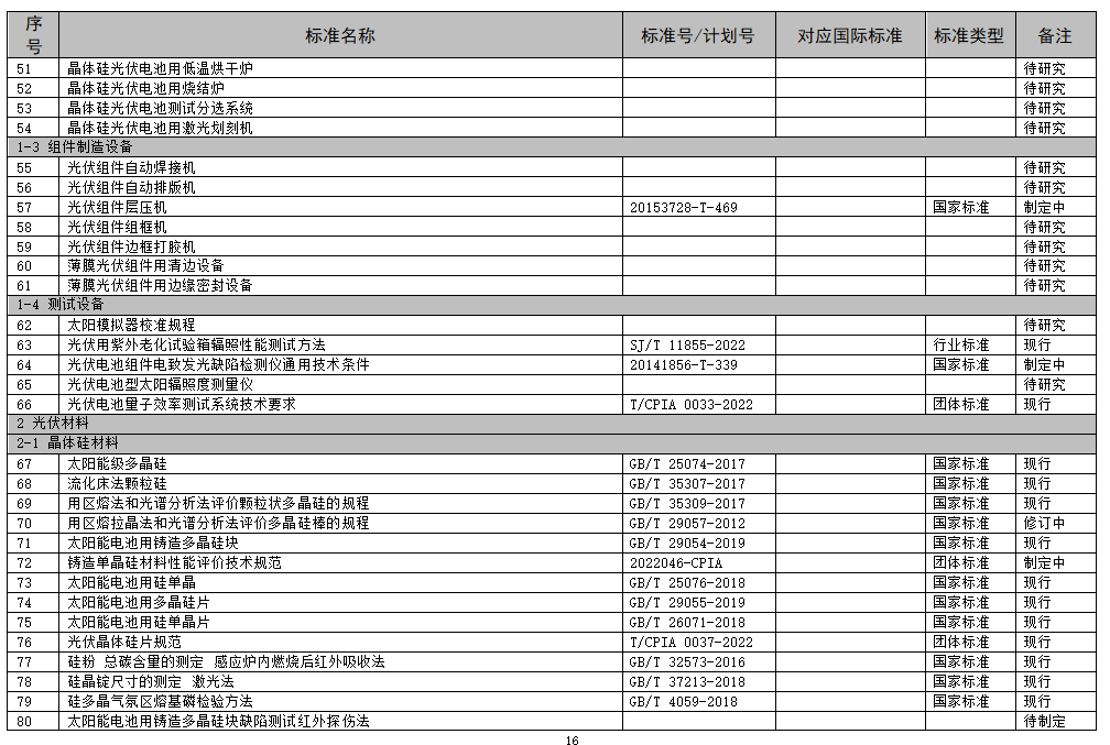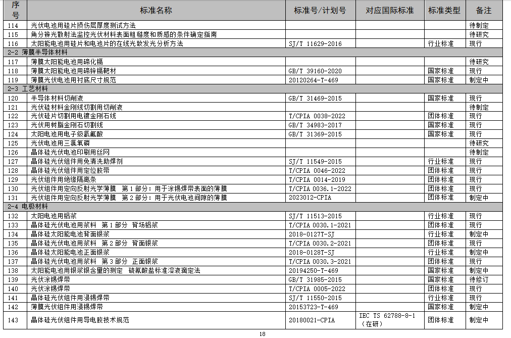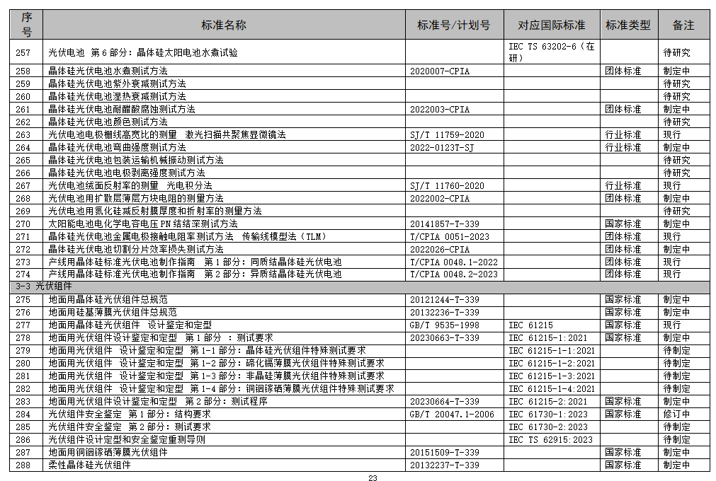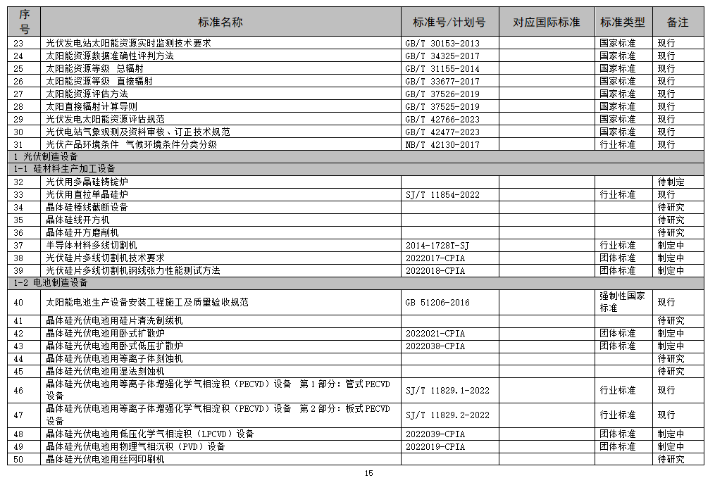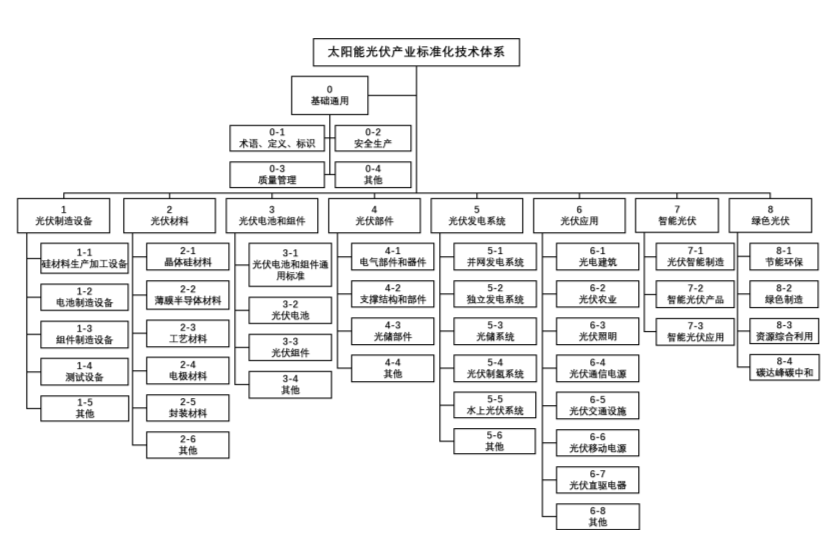 (三)体系内容 1.基础通用标准 基础通用标准包括术语、定义、标识,质量管理和安全生产等方面的相关标准,涵盖光伏产业的基础、共性、综合、通用标准,对产业链各环节具有普遍的适用性和通用性。 (1)术语、定义、标识标准:主要包括光伏产业专用的术语、定义和标识标准,用于统一光伏产业相关概念,为光伏标准体系提供支撑; (2)安全生产标准:主要包括光伏制造和光伏发电工程的安全生产的相关标准,用于指导光伏制造的安全生产; (3)质量管理标准:主要包括光伏制造和光伏发电工程质量管理的相关标准,包括质量体系、可信性管理、监造等标准。 2.光伏制造设备标准 光伏制造设备标准包括硅材料生产加工设备、电池制造设备、组件制造设备和测试设备等方面的相关标准。 (1)硅材料生产加工设备标准:主要包括多晶硅、拉棒/铸锭、开方、切片等环节生产加工设备的相关标准; (2)电池制造设备标准:主要包括扩散炉、刻蚀机、PECVD等晶体硅和薄膜光伏电池制造设备的相关标准; (3)组件制造设备标准:主要包括层压机、焊接机等光伏组件制造设备的相关标准; (4)测试设备标准:主要包括太阳模拟器、电致发光缺陷检测仪、量子效率测试仪等测试设备的相关标准。 3.光伏材料标准 光伏材料标准包括晶体硅材料、薄膜半导体材料、工艺材料、电极材料和封装材料等方面的相关标准,覆盖生产光伏电池和光伏组件所用到的原材料和工艺材料。 (1)晶体硅材料标准:主要包括多晶硅、硅棒、硅锭、硅片、硅粉等光伏用晶体硅材料的相关标准; (2)薄膜半导体材料标准:主要包括靶材和衬底等薄膜光伏电池所需材料的相关标准; (3)工艺材料标准:主要包括切割线、丝网、助焊剂等在光伏产品制造过程中用到的工艺材料相关标准,这些工艺材料通常不作为产品的组成部分; (4)电极材料标准:指在电池及组件上用于收集载流子和传输电流的电极材料,主要包括浆料、焊带、导电胶等相关标准; (5)封装材料标准:主要包括光伏玻璃、光伏背板、光伏封装胶膜、密封胶等光伏组件封装用材料的相关标准。 4.光伏电池和组件标准 光伏电池和组件标准包括光伏器件、光伏电池、光伏组件的测量方法、产品要求、性能评价和测试方法等相关标准。 (1)光伏电池和组件通用标准:以国标GB/T 6495(IEC 60904)系列标准为主,主要包括光伏器件通用测量要求等相关标准; (2)光伏电池标准:主要包括光伏电池的产品标准、测试标准、工艺规程标准等相关标准; (3)光伏组件标准:主要包括光伏组件产品标准、性能测试标准、可靠性测试标准等,范围覆盖晶体硅光伏组件和薄膜光伏组件。 5.光伏部件标准 光伏部件标准包括电气部件和器件、支撑结构和部件、光储部件等方面的相关标准。 (1)电气部件和器件标准:指光伏系统所用的电气部件及其零部件和元器件的标准,主要包括光伏逆变器、汇流箱、控制器、光伏电缆和接线盒等相关标准; (2)支撑结构和部件标准:主要包括光伏支架、跟踪器、浮体等光伏系统所用的支撑结构和部件的相关标准; (3)光储部件标准:指光伏与储能结合的光储系统所用的电气部件相关标准。 6.光伏发电系统标准 光伏发电系统标准包括并网发电系统、独立发电系统、光储系统、光伏制氢系统和水上光伏系统等方面的相关标准。 (1)并网发电系统标准:主要包括并网光伏发电系统的工程规程、技术要求、测试评估、监测预测、项目管理等相关标准; (2)独立发电系统标准:独立光伏系统也称离网光伏系统,主要包括独立光伏系统、光伏提水系统等相关标准; (3)光储系统标准:指光伏与储能结合的光储系统标准,主要包括光储系统设计、验收、运维、性能评价等相关标准; (4)光伏制氢系统标准:指利用光伏能源制氢的光伏制氢系统相关标准,主要包括接口标准和安全要求等标准; (5)水上光伏系统标准:主要包括水上光伏系统和海上光伏系统的相关标准。 7.光伏应用标准 光伏应用标准包括光电建筑、光伏农业、光伏照明、光伏通信电源、光伏交通设施、光伏移动能源、光伏直驱电器等相关标准。 (1)光电建筑标准:指光伏与建筑结合的相关标准,主要包括产品标准、测试标准和系统标准,标准范围涵盖BAPV和BIPV; (2)光伏农业标准:指光伏与农业相结合的相关标准,主要包括光伏与种殖业、林业、畜牧业、渔业等领域结合的标准; (3)光伏照明标准:指光伏能源用于照明领域的相关标准,主要包括光伏路灯、草坪灯等产品的标准; (4)光伏通信电源标准:指光伏能源用于通信电源的相关标准; (5)光伏交通设施标准:指光伏能源用于交通信号灯等交通设施的相关标准; (6)光伏移动电源标准:指光伏能源用于移动能源的相关标准,主要包括便携式光伏电源、可穿戴光伏设备和光伏车辆一体化的标准; (7)光伏直驱电器标准:主要包括光伏直驱空调、光伏直驱热泵等以光伏能源直流驱动电器的相关标准。 8.智能光伏标准 智能光伏标准包括光伏智能制造、智能光伏产品和智能光伏应用的相关标准。 (1)光伏智能制造标准:主要包括光伏产业智能制造有关的数据、通信、信息安全、信息标识、智能工厂、智慧供应链等相关标准; (2)智能光伏产品:主要包括智能光伏组件、智能逆变器、智能跟踪器、智能清扫机器人等智能化光伏产品的相关标准; (3)智能光伏应用:指光伏发电系统智能化应用的相关标准