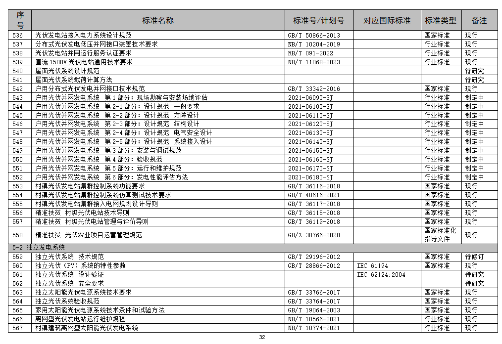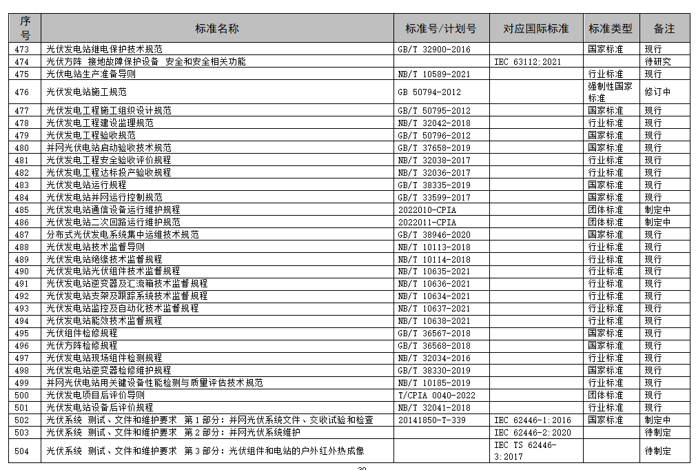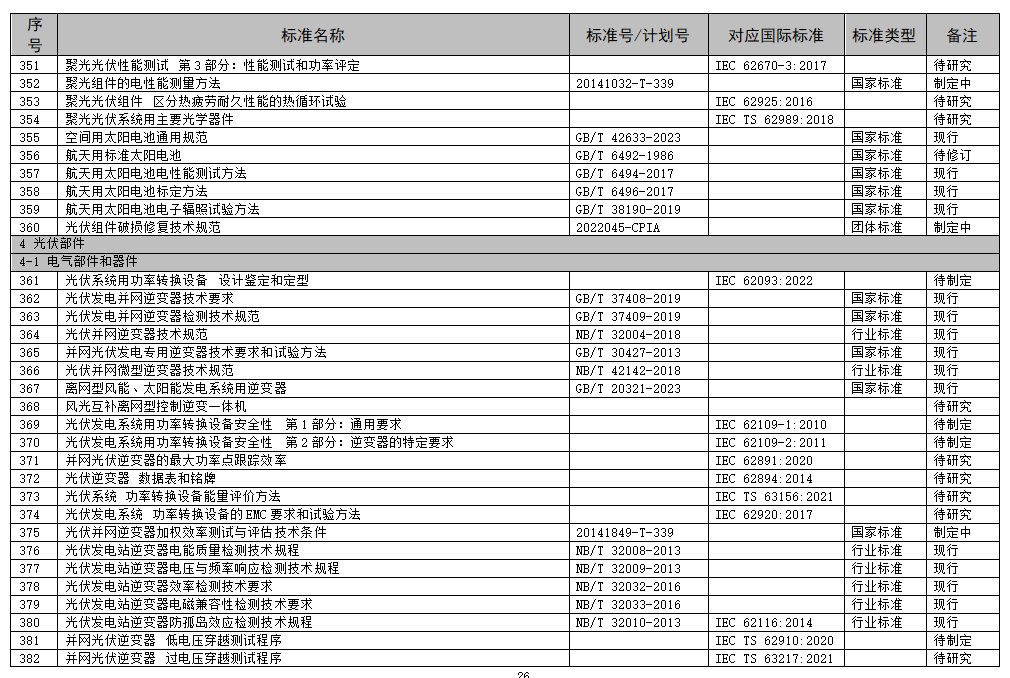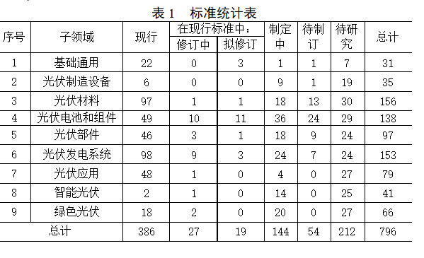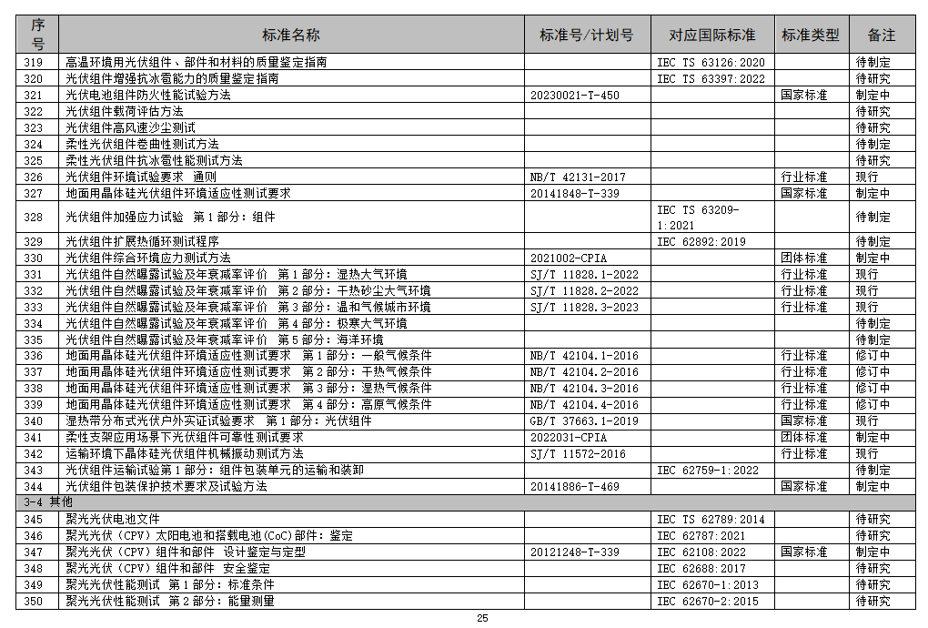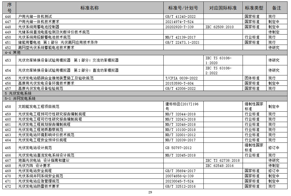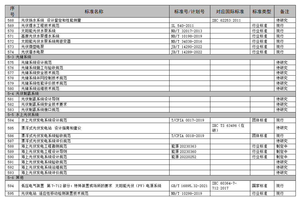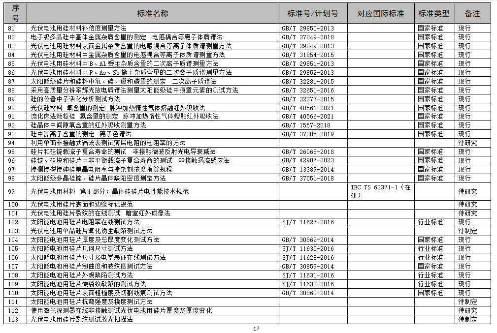 (三)体系内容 1.基础通用标准 基础通用标准包括术语、定义、标识,质量管理和安全生产等方面的相关标准,涵盖光伏产业的基础、共性、综合、通用标准,对产业链各环节具有普遍的适用性和通用性。 (1)术语、定义、标识标准:主要包括光伏产业专用的术语、定义和标识标准,用于统一光伏产业相关概念,为光伏标准体系提供支撑; (2)安全生产标准:主要包括光伏制造和光伏发电工程的安全生产的相关标准,用于指导光伏制造的安全生产; (3)质量管理标准:主要包括光伏制造和光伏发电工程质量管理的相关标准,包括质量体系、可信性管理、监造等标准。 2.光伏制造设备标准 光伏制造设备标准包括硅材料生产加工设备、电池制造设备、组件制造设备和测试设备等方面的相关标准。 (1)硅材料生产加工设备标准:主要包括多晶硅、拉棒/铸锭、开方、切片等环节生产加工设备的相关标准; (2)电池制造设备标准:主要包括扩散炉、刻蚀机、PECVD等晶体硅和薄膜光伏电池制造设备的相关标准; (3)组件制造设备标准:主要包括层压机、焊接机等光伏组件制造设备的相关标准; (4)测试设备标准:主要包括太阳模拟器、电致发光缺陷检测仪、量子效率测试仪等测试设备的相关标准。 3.光伏材料标准 光伏材料标准包括晶体硅材料、薄膜半导体材料、工艺材料、电极材料和封装材料等方面的相关标准,覆盖生产光伏电池和光伏组件所用到的原材料和工艺材料。 (1)晶体硅材料标准:主要包括多晶硅、硅棒、硅锭、硅片、硅粉等光伏用晶体硅材料的相关标准; (2)薄膜半导体材料标准:主要包括靶材和衬底等薄膜光伏电池所需材料的相关标准; (3)工艺材料标准:主要包括切割线、丝网、助焊剂等在光伏产品制造过程中用到的工艺材料相关标准,这些工艺材料通常不作为产品的组成部分; (4)电极材料标准:指在电池及组件上用于收集载流子和传输电流的电极材料,主要包括浆料、焊带、导电胶等相关标准; (5)封装材料标准:主要包括光伏玻璃、光伏背板、光伏封装胶膜、密封胶等光伏组件封装用材料的相关标准。 4.光伏电池和组件标准 光伏电池和组件标准包括光伏器件、光伏电池、光伏组件的测量方法、产品要求、性能评价和测试方法等相关标准。 (1)光伏电池和组件通用标准:以国标GB/T 6495(IEC 60904)系列标准为主,主要包括光伏器件通用测量要求等相关标准; (2)光伏电池标准:主要包括光伏电池的产品标准、测试标准、工艺规程标准等相关标准; (3)光伏组件标准:主要包括光伏组件产品标准、性能测试标准、可靠性测试标准等,范围覆盖晶体硅光伏组件和薄膜光伏组件。 5.光伏部件标准 光伏部件标准包括电气部件和器件、支撑结构和部件、光储部件等方面的相关标准。 (1)电气部件和器件标准:指光伏系统所用的电气部件及其零部件和元器件的标准,主要包括光伏逆变器、汇流箱、控制器、光伏电缆和接线盒等相关标准; (2)支撑结构和部件标准:主要包括光伏支架、跟踪器、浮体等光伏系统所用的支撑结构和部件的相关标准; (3)光储部件标准:指光伏与储能结合的光储系统所用的电气部件相关标准。 6.光伏发电系统标准 光伏发电系统标准包括并网发电系统、独立发电系统、光储系统、光伏制氢系统和水上光伏系统等方面的相关标准。 (1)并网发电系统标准:主要包括并网光伏发电系统的工程规程、技术要求、测试评估、监测预测、项目管理等相关标准; (2)独立发电系统标准:独立光伏系统也称离网光伏系统,主要包括独立光伏系统、光伏提水系统等相关标准; (3)光储系统标准:指光伏与储能结合的光储系统标准,主要包括光储系统设计、验收、运维、性能评价等相关标准; (4)光伏制氢系统标准:指利用光伏能源制氢的光伏制氢系统相关标准,主要包括接口标准和安全要求等标准; (5)水上光伏系统标准:主要包括水上光伏系统和海上光伏系统的相关标准。 7.光伏应用标准 光伏应用标准包括光电建筑、光伏农业、光伏照明、光伏通信电源、光伏交通设施、光伏移动能源、光伏直驱电器等相关标准。 (1)光电建筑标准:指光伏与建筑结合的相关标准,主要包括产品标准、测试标准和系统标准,标准范围涵盖BAPV和BIPV; (2)光伏农业标准:指光伏与农业相结合的相关标准,主要包括光伏与种殖业、林业、畜牧业、渔业等领域结合的标准; (3)光伏照明标准:指光伏能源用于照明领域的相关标准,主要包括光伏路灯、草坪灯等产品的标准; (4)光伏通信电源标准:指光伏能源用于通信电源的相关标准; (5)光伏交通设施标准:指光伏能源用于交通信号灯等交通设施的相关标准; (6)光伏移动电源标准:指光伏能源用于移动能源的相关标准,主要包括便携式光伏电源、可穿戴光伏设备和光伏车辆一体化的标准; (7)光伏直驱电器标准:主要包括光伏直驱空调、光伏直驱热泵等以光伏能源直流驱动电器的相关标准。 8.智能光伏标准 智能光伏标准包括光伏智能制造、智能光伏产品和智能光伏应用的相关标准。 (1)光伏智能制造标准:主要包括光伏产业智能制造有关的数据、通信、信息安全、信息标识、智能工厂、智慧供应链等相关标准; (2)智能光伏产品:主要包括智能光伏组件、智能逆变器、智能跟踪器、智能清扫机器人等智能化光伏产品的相关标准; (3)智能光伏应用:指光伏发电系统智能化应用的相关标准