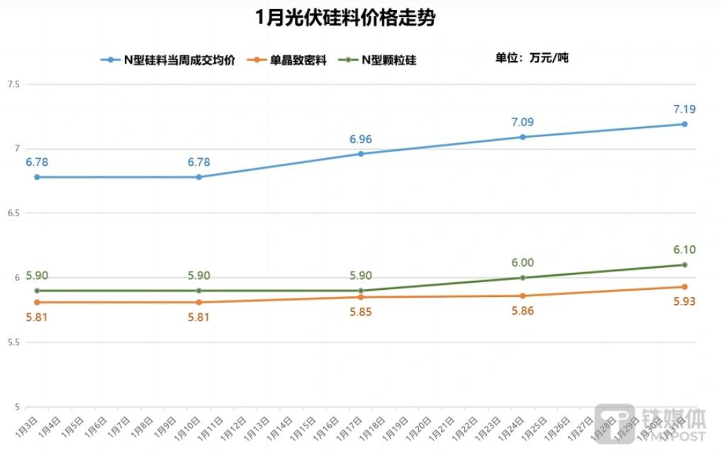 持续走低的价格令制造厂商苦不堪言,行业有关良性竞争、理性投标的呼吁越来越多。在此背景下,2024年开年后的首月,光伏产业链各环节的价格又出现了哪些变化? 各类硅料价格均有所提升 根据中国有色金属工业协会硅业分会1月31日最新发布的太阳能级多晶硅成交价格,N型硅料当周成交价格区间在7.0-7.3万元/吨之间,均价为7.19万元/吨,相比于1月首周6.78万元/吨的均价,增长了6.1%;单晶致密料成交价格区间为5.6-6.4万元/吨,均价为5.93万元/吨,相比于1月首周5.81万元/吨的均价,增长了2.1%。此外,2024年首周起,硅业分会增加了N型颗粒硅的报价,统计“能用于生产N型下游产品的颗粒硅的成交价格”,首周颗粒硅成交均价为5.9万元/吨,最新周均价为6.1万元/吨,累计增长了3.4%。 ![]() 数据来自中国有色金属工业协会硅业分会,钛媒体APP制图 从硅料的全月走势来看,年初首周N型料就较去年底有小幅度提升,但P型料仍维持跌势。不过,到了1月中旬,N型、P型成交价均走高,但N型升幅明显更大,也导致了NP价差的持续扩大。根据硅业分会的解读,1月中旬年前备货需求走强,询价、急单情况明显增多,成交价也随之走高。同时,N型硅料仍存在结构性短缺问题,龙头厂商也显现出了较强的抬价意愿,其价格也因此企稳回升,且后续仍有继续提升的空间。P型价格虽然因应急、企业混包售卖等原因跟涨,但硅业分会认为其涨势难以维系。此外,针对今年报价表中新增的颗粒硅,硅业分会分析称,在目前颗粒硅-棒状硅价差较大的现状下,品质较好的N型颗粒硅涨幅却并不算高,这推动了该产品的市场占有率逐渐上升,根据钛媒体APP此前报道,随着协鑫科技徹底退出棒状硅领域,专注于颗粒硅技术,硅料领域的技术路线之争愈演愈烈,技术含量更高、价格更低的“新势力”颗粒硅能抢占到多少棒状硅的“地盘”,或将成为决定未来行业走势的重要参考指标(颗粒硅VS棒状硅:光伏硅料龙头押注不同技术路线)。 P型硅片价格反超N型 硅片方面,根据InfoLink最新公布的数据,P型M10硅片月底的周成交均价为2.05元/片,P型G12大尺寸硅片月底的周成交均价为2.8元/片;N型M10硅片月底周成交均价为2元/片,N型G12大尺寸硅片月底周成交均价为3.1元/片。对比月初来看,P型M10价格结束跌势,月度累计提升2.5%,P型G12价格与月初持平;但N型硅片价格却较月初均下降3%以上,也导致其价格被以往低于自身的N型硅片反超。 目前来看,开年首月硅片厂的开工率仍未明显下降,库存量仍在增多,在硅料价格走高,电池企业存货较多的情况下,硅片价格的下降空间虽已不多,但上涨动能同样不强。 根据InfoLink的分析,若后续终端需求没有明显复苏,硅片生产企业或将面临与下游需求冲突的销售压力。此外,P型价格的反超势必影响到N型的定价策略,目前N型M10领域已持续有企业酝酿反弹,但受困于成交意愿有限,月底其价格也只是止住了跌势,并未上涨。不过,从整体来看,目前N型硅片比P型要具备更优的性价比。 电池触底止跌,组件颓势不减 在经历了近半年的下降后,电池片价格在1月上旬终于触底反弹,根据InfoLink公布的数据,PERC电池在1月10日的周均价提升了0.01元/W,1月17日再次上涨,随后一直保持稳定;N型电池片价格止跌后也一直保持稳定。综合来看,电池厂在经历亏损后关停产线、大幅减产是该环节价格企稳的重要原因,而在技术迭代过程中,“老一代”PERC电池产线锐减,反而造成了高效率PERC电池片供应紧张的情况,其价格也因此提升。不过,InfoLink认为电池厂家目前仍缺乏盈利能力,在低库存水平与进一步减产的预期下,后续价格可能“微涨”,但最终仍需看组件厂家的“脸色”。 而业界关注度最高的组件方面,1月的情况却远不如其上游三大环节乐观。 根据InfoLink公布的数据,1月中上旬,N型TOPcon组件的成交均价降至了0.98元/W,步P型组件后尘跌穿1元线。此后,N型、P型组件价格均呈整体下降趋势,到了月底,PERC的周均价在0.88元-0.9元/W之间,TOPcon周价格在0.93-0.96元/W之间。 硅业分会分析称,组件1月价格持续走低的主要原因是受季节因素影响(一季度是地面电站安装淡季),目前组件领域库存高企,销售环节压力越来越大。在此情况下,虽有部分组件厂家考虑调涨报价,但订单需求有限,新单交付持续减少,价格无法得到支撑。 在招投标方面,1月9日中国电建2024年度光伏组件框架入围集中采购招标开标中,P型最低价为0.806元/W、N型最低价为0.87元/W,均创下新低。此后1月20日的华能集团2024年10GW光伏组件框架协议采购开标中,P型组件最低投标价进一步降至0.79元/W;在2月1日中石油集团公司2024年N型光伏组件集中采购项目开标中,N型最低报价也跌倒了0.82元/W的水平。在N型TOPCon的生产成本普遍位于0.95元/W左右的情况下,组件的价格战恐怕还会导致相关企业业绩进一步承压。