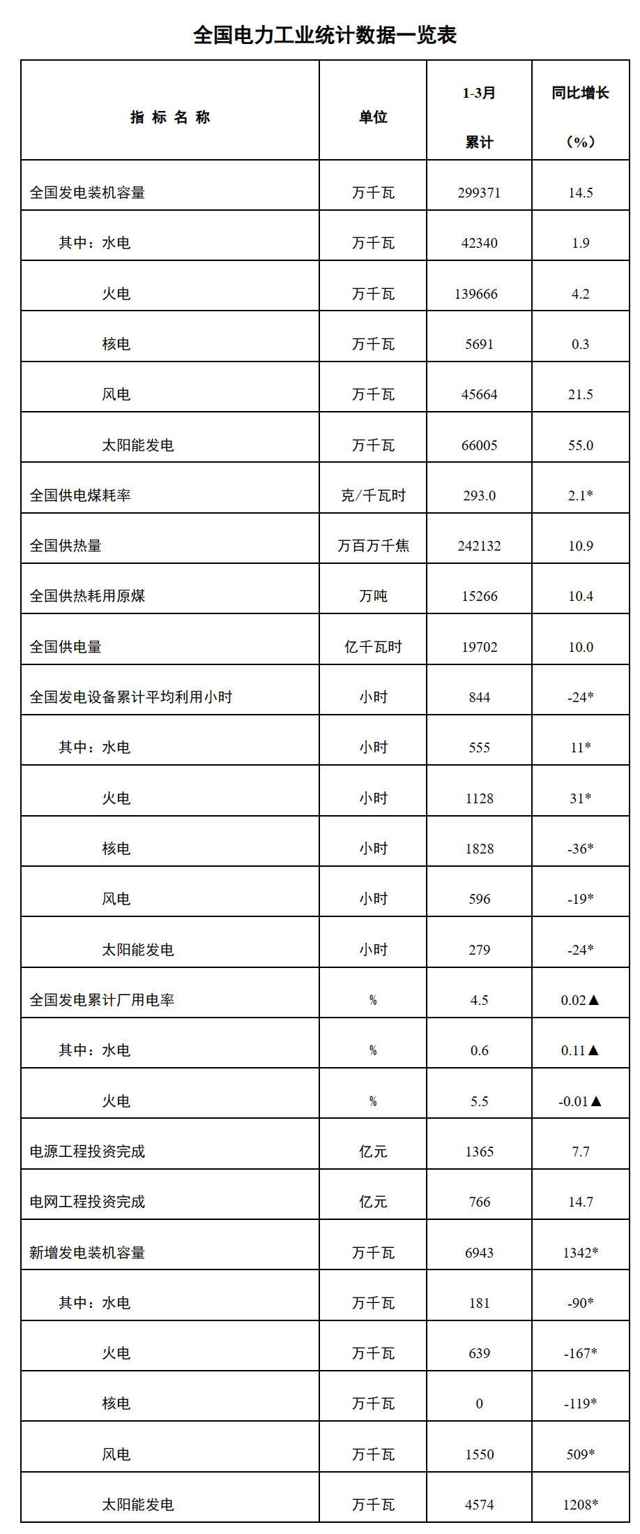 截至3月底,全国累计发电装机容量约29.9亿千瓦,同比增长14.5%。其中,太阳能发电装机容量约6.6亿千瓦,同比增长55.0%;风电装机容量约4.6亿千瓦,同比增长21.5%。