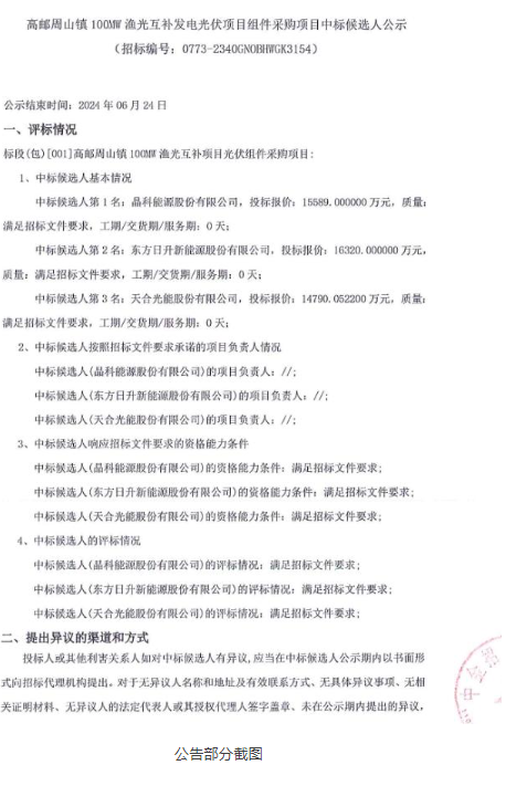 第1中标候选人:晶科能源股份有限公司(简称:晶科能源),投标报价15589万元;