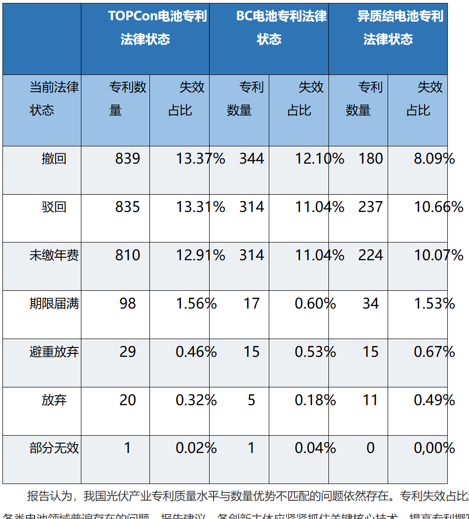 创新加速背后专利稳定性存在隐患 报告通过专利授权、实质审查、撤回、驳回、放弃、期限届满等状态的占比,分析专利申请国家的技术含量,评估专利风险总体水平和专利活跃程度。在TOPCon电池领域,我国授权、实审及公开专利占总申请量的58.1%。失效专利占总申请量的41.9%,即近一半的专利失效。其中,撤回或被驳回超过26%,因未缴年费而失效的专利近13%。在BC电池领域,我国授权、实审及公开专利占总申请量的64.9%。失效专利占比35.1%,其中,撤回和被驳回专利数量占比超过23%;因未缴年费而失效的专利占比超过11%。在异质结电池领域,我国授权、实审及公开专利占总申请量的68.5%。失效专利占比31.5%,其中,撤回和被驳回专利数量占比超过18%,因未缴年费而失效的专利占比超过10%。 总体来看,我国创新主体在三种电池领域申请的专利存在质量不高的问题,同时部分专利缺乏战略意义而使创新主体丧失维护权利的主动性,最终导致大量申请专利失效。