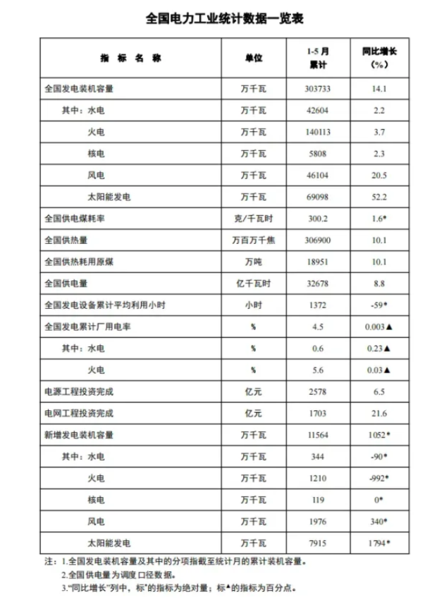 6月28日,国家能源局发布1-5月份全国电力工业统计数据。