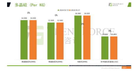 根据TrendForce集邦咨询新能源研究中心2024年8月21日的报价,单晶复投料人民币价格为 RMB34/KG,单晶致密料最新人民币价格为 RMB32/KG。N型料人民币价格为 RMB38/KG。非中国区多晶硅料美金价格为 US$20KG。