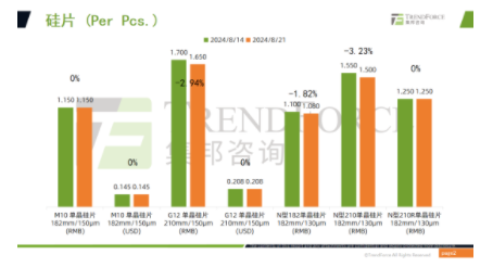 M10单晶硅片人民币报价为 RMB1.15/Pc,美金报价为 US$0.145/Pc,均保持不变。G12成交价格掉落至 RMB1.65/pc,跌幅为 2.94%;美金报价为 US$0.208/Pc。N型182单晶硅片人民币主流成交价格从 RMB1.1/pc 下滑至 RMB1.08/pc,变动幅度为-1.82%;N型210单晶硅片人民币成交价较上一周减少3.23%,最新价格为 RMB1.5/pc;N型210R单晶硅片最新价格依旧为 RMB1.25/pc。