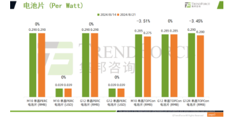 M10 单晶PERC电池片人民币价格为 RMB0.29/W,美金报价为 US$0.039/W。G12 单晶PERC电池片人民币报价为 RMB0.29/W;美金价格为 US$0.039/W。M10 单晶TOPCon 电池片人民币价格下滑至RMB0.275/W。G12 单晶TOPCon 电池片人民币价格为 RMB0.285/W。G12R 单晶TOPCon电池片人民币价格为 RMB0.28/W,与前一周相比减少了3.45%。