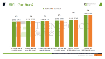 182mm 单面单晶PERC组件价格为RMB0.71/W;210mm 单面单晶PERC组件报价为 RMB0.73/W。182mm 双面双玻单晶PERC组件报价为 RMB0.72/W。210mm 双面双玻单晶PERC组件价格为 RMB0.74/W。182mm TOPCon双面双玻组件价格保持在 RMB0.76/W。210mm HJT双面双玻组件价格为 RMB0.9/W。