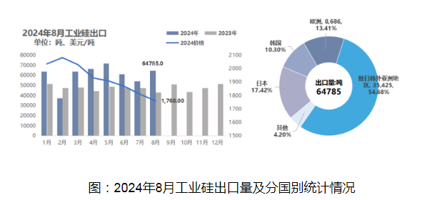 据海关数据,2024年8月份工业硅出口6.48万吨,环比增加19.78%,同比增加49.65%,较7月份出口量增加。主要原因是进入8月份海外采购活跃度提高,海运运费也有所下降,且前期出口税收方面的影响减弱,出口量小幅增加。分国别和地区来看,对日本出口1.13万吨,环比增加29.24%,对韩国出口0.67万吨,环比增加3.59%,对欧洲出口0.87万吨,环比减少9.69%,对除日韩外的亚洲地区出口3.54万吨,环比增加31.43%。2024年8月份工业硅出口均价为1760美元/吨,环比下跌2.71%,同比下跌11.47%,主要原因是工业硅市场持续低迷,价格底部震荡,出口价格受国内市场影响下跌。