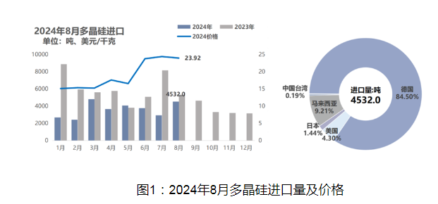 根据海关最新数据显示,2024年8月我国多晶硅进口量为4532.0吨,环比上涨55.13%。其中,自德国的进口量3829.3吨,占总进口量的84.50%,相较7月份进口量环比上涨117.67%,为我国当月多晶硅最大的进口国。自马来西亚进口量417.6吨,占总进口量的9.21%,环比下降59.30%。从以上两国进口的多晶硅占总进口量的93.71%。8月多晶硅进口量有所反弹并非出于基本面因素,主要是由于海外厂商国内备货所致,因此推测9月硅料进口量将出现小幅下滑。8月份多晶硅进口均价23.92美元/千克,环比下降1.81%,两大主要进口来源国进口均价分别为:德国23.87美元/千克,马来西亚16.70美元/千克,价格分别下跌11.05%及13.29%。进口价格近月来首次出现跌势,推测前期高价急单基本已经在8月履行完毕,9月进口硅料价格将以持平为主。