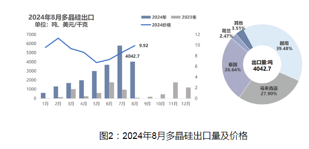 根据海关最新数据显示,2024年8月我国多晶硅出口量为4042.7吨,环比下降30.21%。其中,向越南出口量为1596.0吨,占总出口量的39.48%。向马来西亚出口量1128吨,占总出口量的27.90%,对以上两地出口的多晶硅占总量的67.38%。8月份我国出口呈现对欧盟出口拉动大幅增强,对东盟国家出口有所减弱的局面。其中,欧洲地区的光伏装机补贴是荷兰等地需求好转的潜在原因。而对马来西亚等东盟国家的出口进度受海运运力紧张、港口拥堵等原因出现回落。同时,美国大选带来的不确定性也抑制了对东盟国家的出口增速。8月我国多晶硅出口均价为9.92美元/千克,环比上涨14.55%。两大主要出口国均价分别为越南7.18美元/千克,马来西亚9.73美元/千克,环比上涨24.57%及6.18%。
