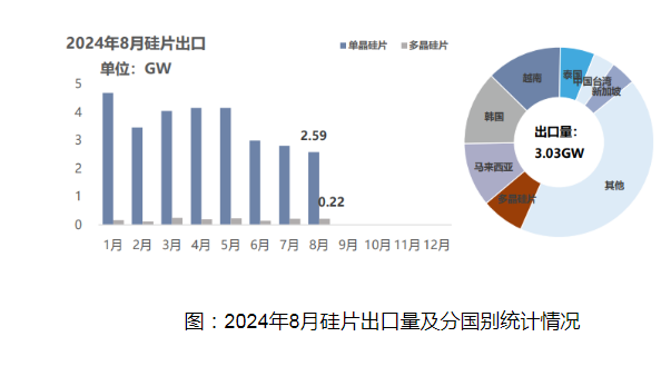 2024年8月国内硅片出口量2.81GW,环比减少7.26%,其中单晶硅片出口2.59GW,环比减少7.83%,多晶硅片出口0.22GW,环比持平;1-8月国内硅片出口量29.35GW,同比增长3.71%。