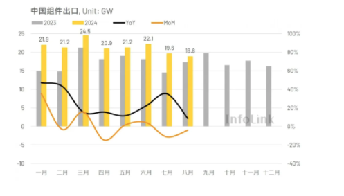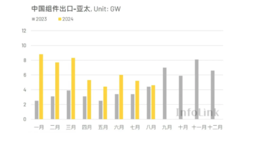 2024年8月亚太市场从中国进口约4.63GW的光伏组件,相比七月的5.16GW环比下降10%,与去年八月的4.42GW相比则上升5%。今年一至八月,亚太市场累计拉货量约为50.27GW,相比去年同期的26.42GW上升90%。