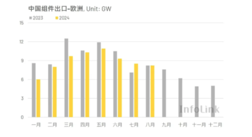 2024年8月欧洲市场从中国进口约8.21GW的光伏组件,相比七月的8.52GW环比下降4%,与去年八月的8.16GW近乎持平。今年一至八月,欧洲市场累计拉货量约为70.9GW,相比去年同期的77.69GW下降10%。