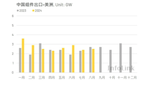 2024年8月美洲市场从中国进口约2.55GW的光伏组件,相比七月的2.35GW环比上升9%,与去年八月的2.68GW相比则下降5%。今年一至八月,美洲市场累计拉货量约为21.65GW,相比去年同期的19.3GW上升12%。