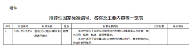 根据标准制修订计划,相关标准化技术组织已完成《退役光伏组件梯次利用通用规范》推荐性国家标准的制修订工作。在以上标准批准发布之前,为进一步听取社会各界意见,现予以公示,截止日期2024年10月16日。