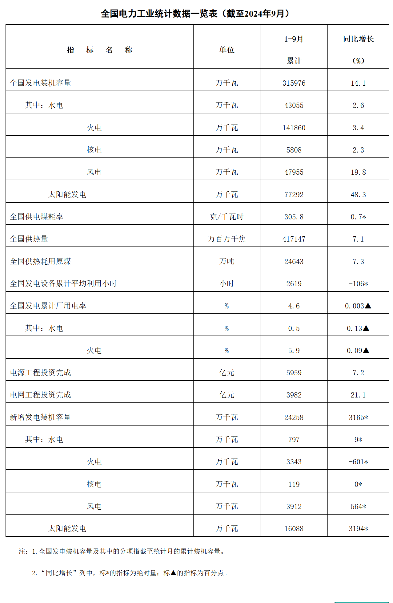10月21日,国家能源局发布2024年1-9月份全国电力工业统计数据。 截至9月底,全国累计发电装机容量约31.6亿千瓦,同比增长14.1%。其中,太阳能发电装机容量约7.7亿千瓦,同比增长48.3%;风电装机容量约4.8亿千瓦,同比增长19.8%。