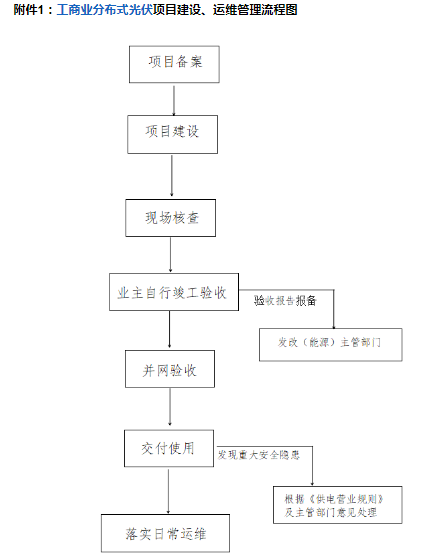 第十九条工商业分布式光伏原则上由项目投资企业自行组织验收,项目总承包单位或安装企业配合,鼓励行业协会提供验收专家支持。验收合格后,报备属地发改(能源)主管部门。属地发改(能源)主管部门也可根据实际工作需求,制定本辖区的验收办法。