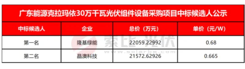 中标候选人第一名隆基绿能,投标价22059.22992万元,单价0.68元/W。