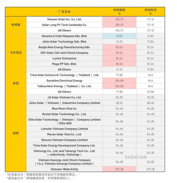 此外,文中 Hanwha Q Cells 被标注为 This rate is de minimis(见上图蓝色备注部分),类似情况在之前的反补贴(CVD)裁定中,泰国的 Trina 和越南的 Boviet 也曾出现。这部分预期是当局判定其倾销或补贴幅度较小,对市场影响有限,因而课以较低税率。