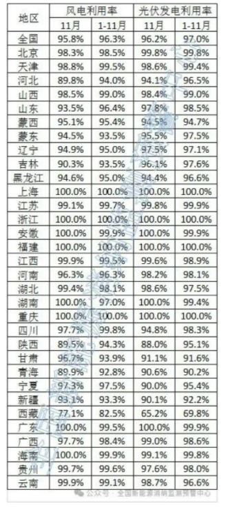 1月2日,全国新能源消纳监测预警中心公布11月各省级区域新能源并网消纳情况,11月光伏发电利用率光伏96.2%,风电95.8%。