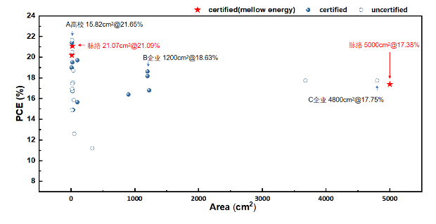 此前,脉络能源已成功实现1.2x1.6m2一体化成型柔性组件制备技术的开发。此次高效率素笺系列产品的认证,预示着脉络能源将可以为市场提供不同尺寸的柔性和弱光钙钛矿光伏组件产品。