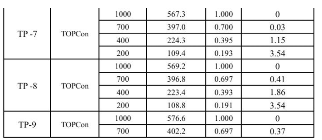 4个HJT组件样品在低辐照度条件下的整体表现略优于TOPCon组件,但也存在像HJT-4这种低辐照损失率较大的产品。而HJT-1样品在700 W/m2,400 W/m2的辐照度条件下,功率损失率为负数,只是在200 W/m2的辐照度下,有较小的功率损失,表现出了较好的低辐照性能。
