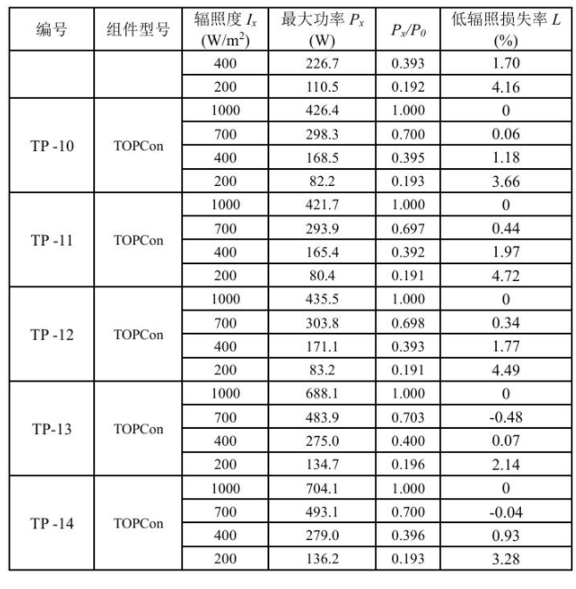 可以看出,不同的TOPCon组件的低辐照性能也存在明显的差异。例如:200 W/m2的辐照度下,低辐照度损失率最小为2.14%,最大为4.72%。这些样品在200 W/m2的辐照度下的平均低辐照损失率达到了3.65%,有5个样品更是达到了4%以上。