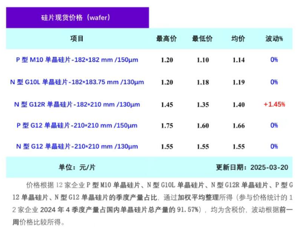 本周硅片价格继续上行,其中N型G10L单晶硅片(182*183.75mm/130μm/256mm)成交均价在1.19元/片,环比持平;N型G12R单晶硅片(182*210mm/130μm)成交均价在1.40元/片,周环比涨幅1.45%;N型G12单晶硅片(210*210 mm/150μm)成交均价在1.55元/片,环比持平。本周头部企业提价意愿强烈,G12R价格继续保持上涨态势,其他型号硅片市场价格暂无明显变化。
