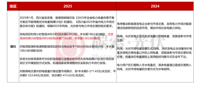 2025年1月,四川省发改委、能源局相继印发《2025年全省电力电量供需平衡方案及节能调度优先电量规模计划》的通知、《四川省2025年省内电力市场交易总体方案》的通知,明确2025年风电、光伏参与电力市场交易的相关要求。
