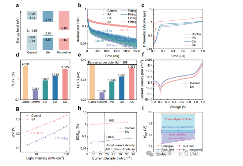 图3:减少非辐射复合。a从对照和SA处理基板的UPS光谱中得出的价带最大值(VBM)和导带最小值(CBM)的能级。b沉积在各种混合SAM上的钙钛矿薄膜的TRPL衰减。c根据TRPL拟合计算的微分寿命。沉积在玻璃和各种HTL上的WBG钙钛矿薄膜的d PLQY值和e QFLS值。f暗J-V曲线,(g)VOC光强度依赖性,(h)EQEEL测量值,以及(i)基于控制和SA的WBG设备的详细VOC损失分析。