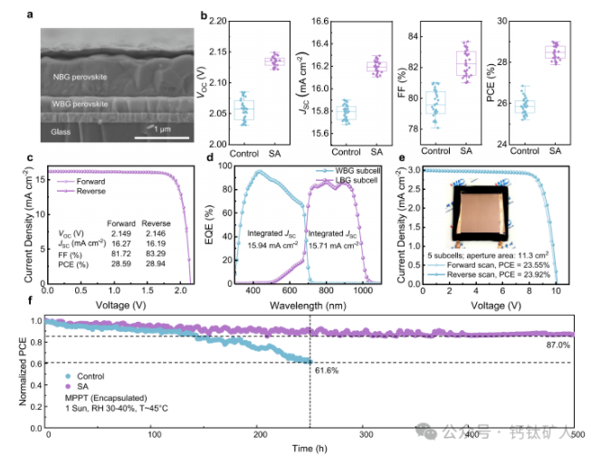 图4:器件的光伏性能。SA基全钙钛矿TSC的横截面SEM图像。b基于控制和SA的全钙钛矿TSC的光伏性能统计。c基于SA的冠军全钙钛矿TSC的J-V曲线和d EQE光谱。e孔径面积为11.3cm2的SA基全钙钛矿串联微型模块的J-V曲线。f在环境空气中使用MPPT在1个太阳连续照射下,控制和基于SA的封装串联器件的长期运行稳定性。