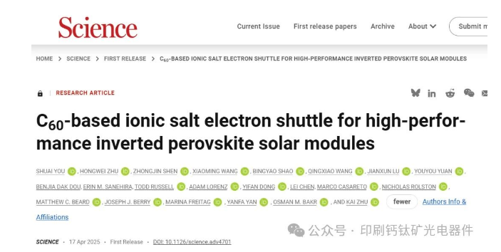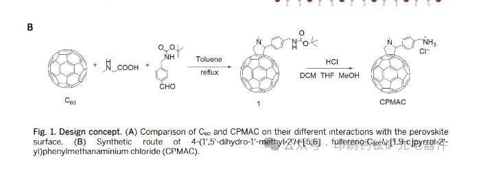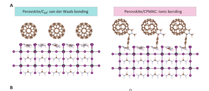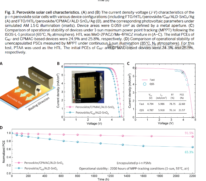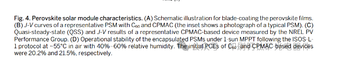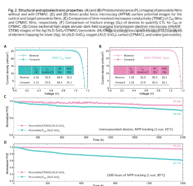尽管C60通常作为反式钙钛矿太阳能电池中的电子传输层,但其分子特性导致界面结合力较弱,引发非理想的界面电子与机械性能退化。鉴于此,NREL朱凯课题组在期刊《Science》上发文“C60-based ionic salt electron shuttle for high-performance inverted perovskite solar modules”以C60为原料合成了一种离子盐——4-(1',5′-二氢-1'-甲基-2'H-[5,6]富勒烯-C60-Ih-[1,9-c]吡咯-2'-基)苯甲胺氯化物(CPMAC),并将其作为电子传输介质应用于反式钙钛矿太阳能电池中。CPMA阳离子中的CH2-NH3+头部基团有效改善了电子传输层界面性能,其离子特性还增强了分子堆叠密度,使界面韧性较C60提升约3倍。采用CPMAC后,电池在65℃、1个太阳光强度下持续运行2,100小时后,功率转换效率达到约26%,且衰减率仅为~2%。对于迷你组件(四子电池结构,6平方厘米),在55℃运行2,200小时后仍保持约23%的效率,衰减率不足9%。