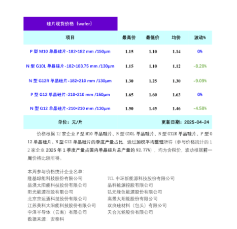 本周硅片价格保持下行态势,其主要原因是下游终端组件需求快速回落,导致电池排产下降,对硅片需求大幅减弱,市场活跃度明显萧条,上下游成交氛围低迷。具体来看,市场在政策节点将至的情形下,看跌后市,部分硅片企业恐慌性降价出货。同时,上游多晶硅价格大幅下跌,下游认为硅片后续降幅空间增大,以及美国对等关税和美国对柬埔寨、马来西亚、泰国和越南东南亚四国的光伏产品增加关税,这一系列因素带动硅片市场价格下行。虽然硅片价格下行,但行业供应暂未明显变化。据统计,本周行业整体开工率在55%-60%,两家一线企业开工率维持在60%和58%,一体化企业开工率在60%-80%之间,其余企业开工在56%-80%之间。