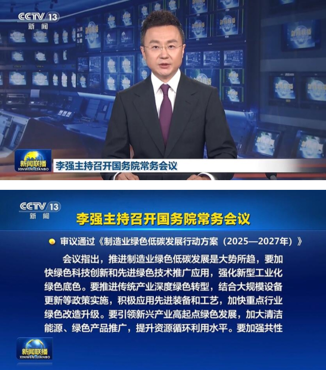 5月23日,国务院总理李强主持召开国务院常务会议,审议通过《制造业绿色低碳发展行动方案(2025—2027年)》。