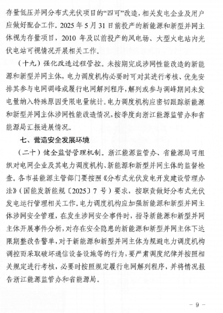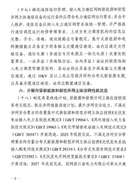 近日,浙江能源监管办、浙江省能源局联合印发了《关于进一步提升浙江省新能源和新型并网主体涉网安全能力的通知》。《通知》围绕提升涉网安全性能,加强新能源和新型并网主体涉网参数管理,优化并网接入管理,强化并网运行管理,开展存量新能源和新型并网主体涉网性能改造等方面,提出了具体的措施和要求。