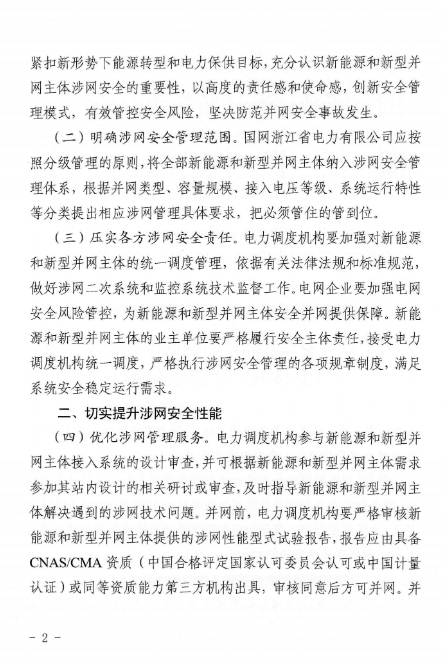 《通知》明确了涉网安全管理范围。国网浙江省电力有限公司应按照分级管理的原则,将全部新能源和新型并网主体纳入涉网安全管理体系,根据并网类型、容量规模、接入电压等级、系统运行特性等分类提出相应涉网管理具体要求,把必须管住的管到位。