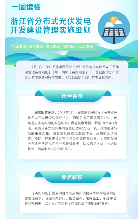 7月7日,浙江省能源局正式发布《浙江省分布式光伏发电开发建设管理实施细则》,覆盖项目定义分类和项目全生命周期各阶段的管理要求,明确有关部门,投资主体,电网企业,承建单位等各方职责,结合浙江省实际补全国家办法中未明确的事宜。