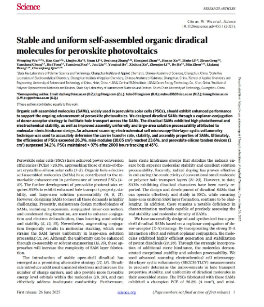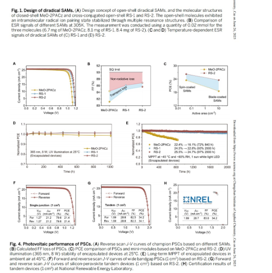 此前不久,隆基绿能联合中国科学院长春应用化学研究所等研究团队,通过采用给受体共轭策略,成功开发了一种具有开壳双自由基的新型有机自组装分子。该分子展现出优异的载流子传输能力、在实际工况下的优异结构稳定性以及卓越的组装均匀性,使得基于该材料的钙钛矿太阳能电池在效率和稳定性方面均取得了显著进展。相关研究成果以《Stable and uniform self-assembled organic diradical molecules for perovskite photovoltaics》为题,于2025年6月26日发表于国际顶级学术期刊《Science》上。